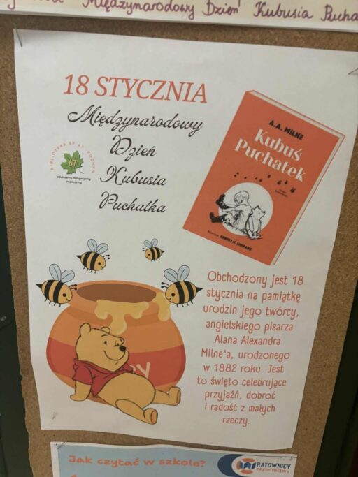 W styczniu świętowałyśmy Dzień Kubusia Puchatka, zaprosiliśmy do zabawy klasę 2E, która z ogromną przyjemnością wysłuchała przygód misia. Uczestnicy zajęć przygotowali dla siebie opaskę z uszkami, więc już na przerwie szkołę opanowały małe misie.