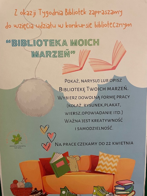 Biblioteka szkolna zaprasza do udziału w konkursie bibliotecznym „Biblioteka moich marzeń”. Czekamy na prace, które pokażą nam o jakiej bibliotece marzycie. Technika i forma pracy jest dowolna, co oznacza, że Wasza wyobraźnia nie ma ograniczeń. Na prace czekamy do 22 kwietnia.