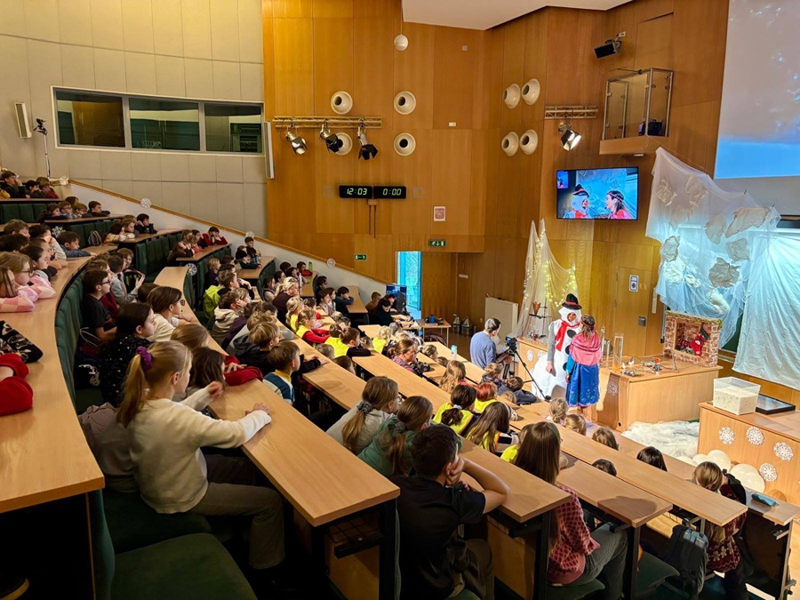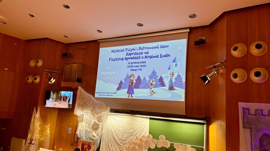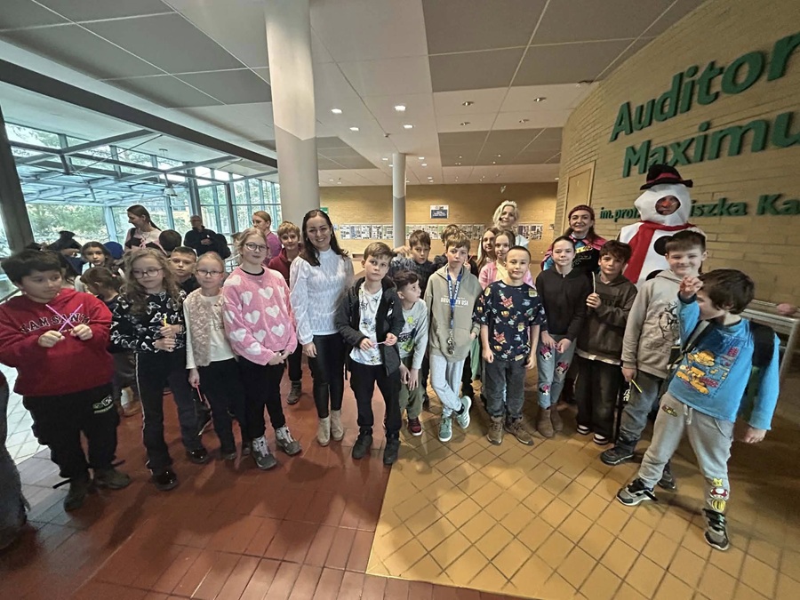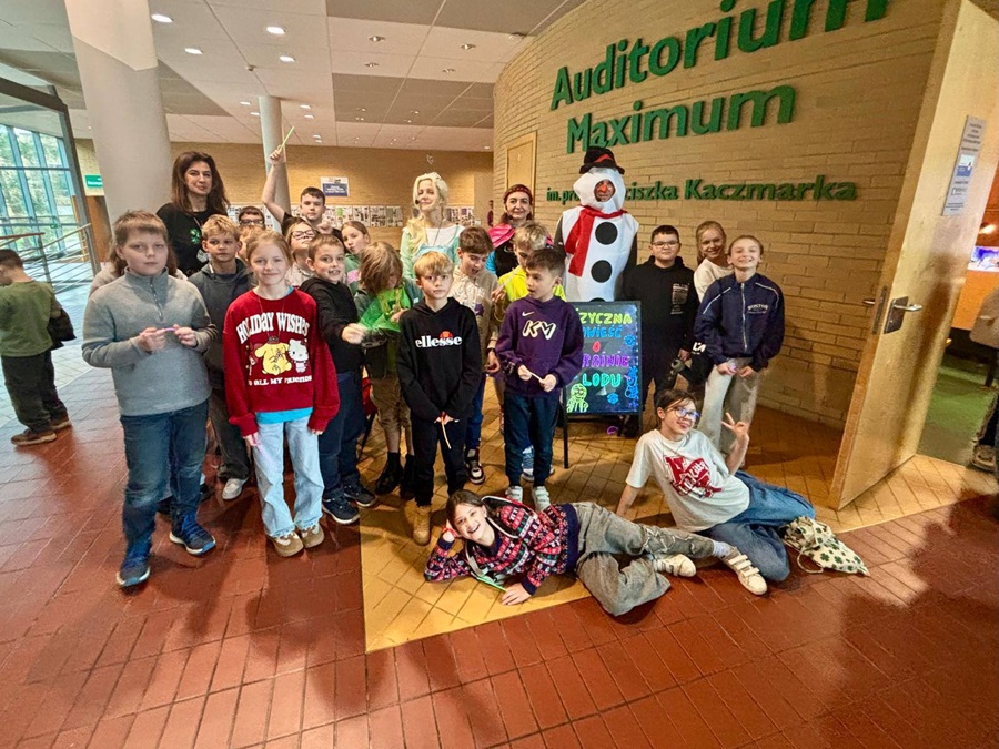 Klasy 4a i 4c wzięły udział w wyjściu edukacyjnym na Wydział Fizyki UAM. Uczniowie uczestniczyli w pokazie „Fizyczna Kraina Lodu”, który odbył się w Auditorium Maximum na Wydziale Fizyki i Astronomii UAM. Podczas zajęć dzieci obserwowały ciekawe doświadczenia fizyczne oraz mogły zobaczyć, w jaki sposób wiedza z fizyki wykorzystywana jest do rozwiązywania różnych wyzwań i problemów, przenosząc się na czas pokazu w zimową scenerię Krainy Lodu.