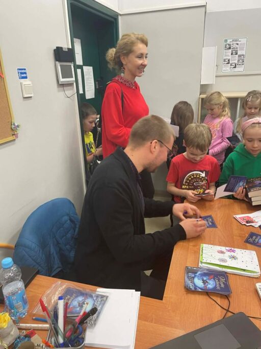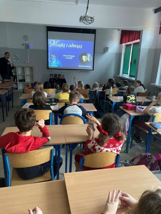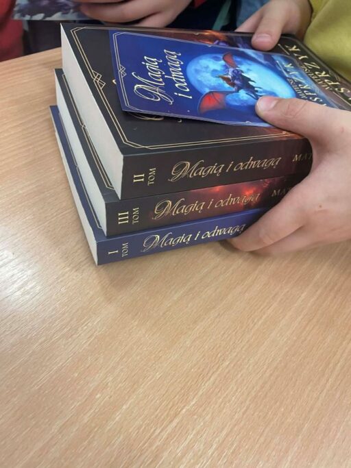 Najważniejszym wydarzeniem do tej pory było jednak spotkanie z pisarzem! Uczestniczenie w nim było nagrodą w konkursie bibliotecznym na przygotowanie plakatu w Tygodniu Jeża. Pan Mateusz Kasprzyk, który przyszedł do naszej szkoły 8 grudnia na aż trzy spotkania, jest autorem trylogii „Magią i odwagą”. „Magią i odwagą” jest historią syna smoczego pilota, który próbuje uratować swoją przyjaciółkę, księżniczkę Maję i przeżywa mnóstwo fantastycznych przygód. Pan Mateusz opowiedział podczas spotkań o swoich dziecięcych marzeniach, o drodze jaką pokonuje książka od pomysłu do księgarni i o tym, że warto zatrzymać w sobie małego siebie. Najgorętszą częścią spotkań była wizualizacja bohaterów i wymyślonego świata, który poznajemy trzech częściach powieści. Bardzo dziękujemy panu Mateuszowi Kasprzykowi za podarowane książek do naszej bibliotek i odwiedziny, które były bardzo cennym przeżyciem dla jego czytelników.