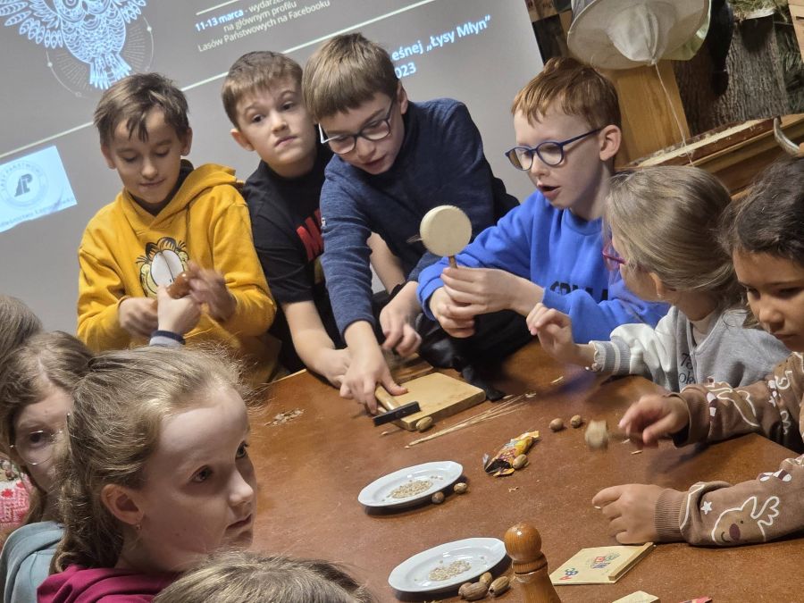 ​To był dzień pełen sensorycznych doświadczeń! Uczniowie mieli okazję poznać różne rodzaje ptasich piór, dotykając ich, a także zgłębić wiedzę o gatunkach sów i ich cechach charakterystycznych. Nie zabrakło również czasu na ciekawostki przyrodnicze – dzieci poznawały różne rodzaje zbóż, a także przyglądały się zabawkom i przedmiotom codziennego użytku wykonanym z drewna.