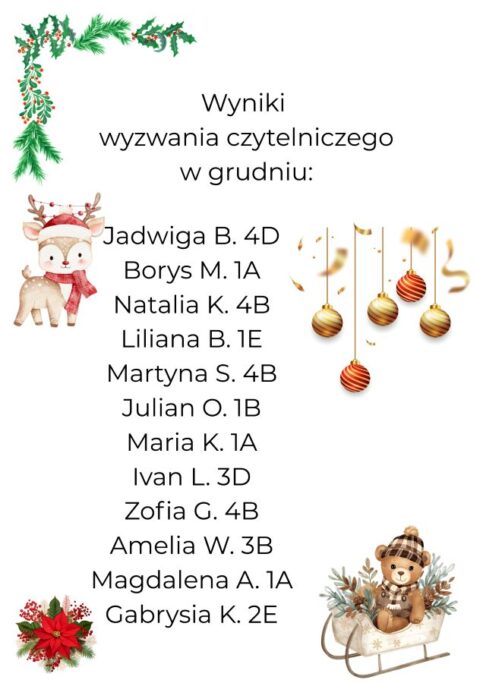 Ogłoszenie wyników bibliotecznego wyzwania czytelniczego w grudniu. Zadaniem dzieci było czytać codziennie dowolną książkę przez minimum 15 minut i zakolorować jeden obrazek po czytaniu. Karty wzięły udział w losowaniu nagród! Gratulacje! Zapraszamy do biblioteki po odbiór drobnych upominków.